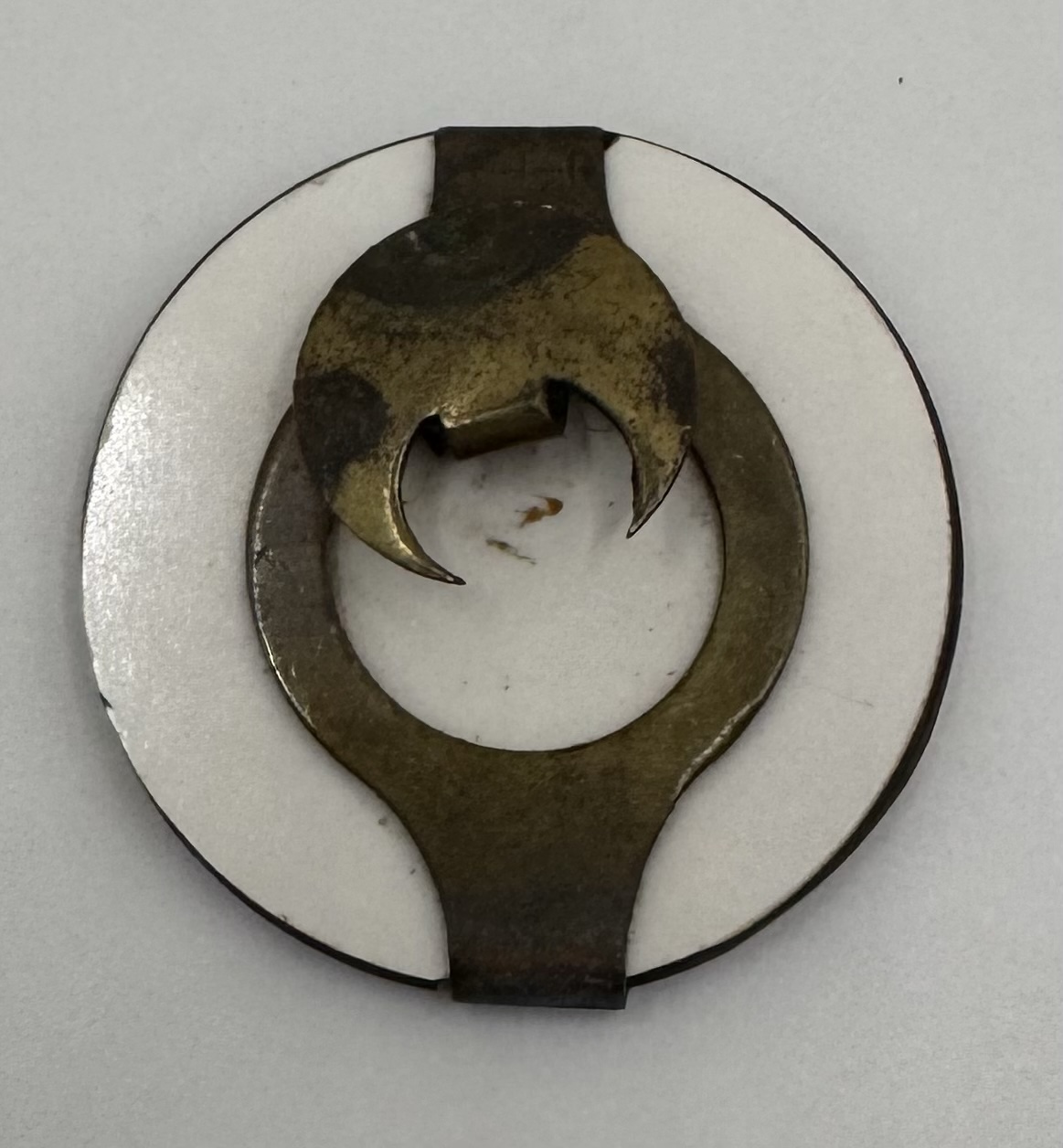 It’s in very good condition with no visible scratches or chips to the badge and the brass half moon pin on the reverse is all good and intact.